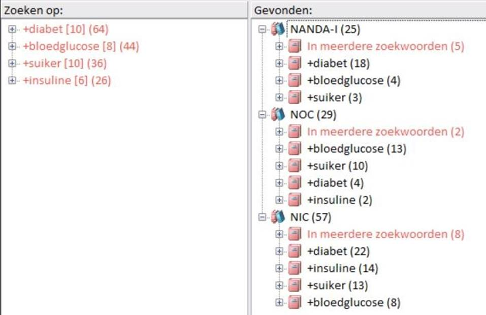 Vaak is het moeilijk om te weten op welk woord je moet zoeken. NANDA-I, NOC en NIC gebruiken vaak verschillende woorden voor hetzelfde/op elkaar gelijkende woorden en als je dat niet weet, dan zul je niet alle NNN-items vinden waar je naar wilt/moet zoeken. Om je te helpen hebben we het concept “Koppelwoorden” bedacht. Als je op een woord zoekt dan zal er ook gezocht worden naar alle opgegeven Koppelwoorden. Als je op “diabetes” zoekt dan zal Chiron je ook de resultaten laten zien van de koppelwoorden: “bloedglucose”, “suiker en “insuline”.