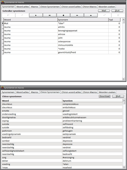 In het beheer scherm zie je dat je je eigen koppelwoorden kunt beheren (tabblad Koppelwoorden) en dat je kunt kijken welke koppelwoorden Chiron heeft (tabblad Chiron Koppelwoorden). In het tabblad Koppelwoorden kun je eenvoudig koppelwoorden toevoegen, verwijderen en aanpassen. De kolom “Taal” staat standaard op de waarde 0 (de Nederlandse taal), maar je kunt ook Engelse koppelwoorden maken en dan als taal 1 invullen (Chiron is tweetalig, zowel in de schermen als in de databank). Hierboven zie je een voorbeeld voor koppelwoorden die te maken hebben met “reuma”. Dus als je op “reuma” zoekt dan krijg je ook de andere woorden als resultaat te zien. Dit is echt nodig want het woord “reuma” komt maar één keer voor in NNN.