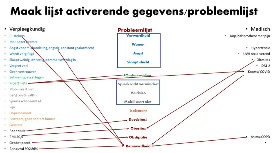 Wij vertrekken vanaf de gegevens van de gemaakte anamnese en het lichamelijk onderzoek die niet normaal zijn (die noemen wij activerende gegevens). Deze gegevens zetten we op een rij. Dit dwingt de verpleegkundige om naar aanleiding van de anamnese en het lichamelijk onderzoek zijn gedachten te ordenen en systeem aan te brengen in de bevindingen. Dan volgt de tweede stap, het samenstellen van een probleemlijst waarin al de gevonden activerende gegevens, samengevoegd tot problemen, worden ondergebracht. Er kan zodoende niets worden vergeten. Door de probleemlijst in te vullen in het Analyseer scherm van Chiron krijg je een overzicht van NNN-items die kandidaten zijn voor het maken van een zorgplan voor de patiënt. Dit gaan we in het volgende hoofdstuk uitleggen. Belangrijk is dat je de hoeveelheid activerende gegevens beperkt houdt of in groepen/clusters in Chiron analyseert. Zo hou je overzicht, vooral als de casus complexer is en er veel zaken spelen in de probleemlijst.