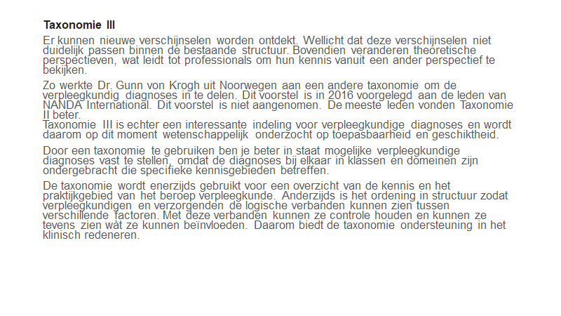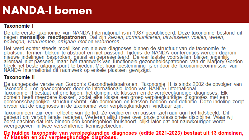 Voor de NANDA-I hebben we diagnostische kenmerken, dat is uitgebreider dan de Etiology en Symptoms: