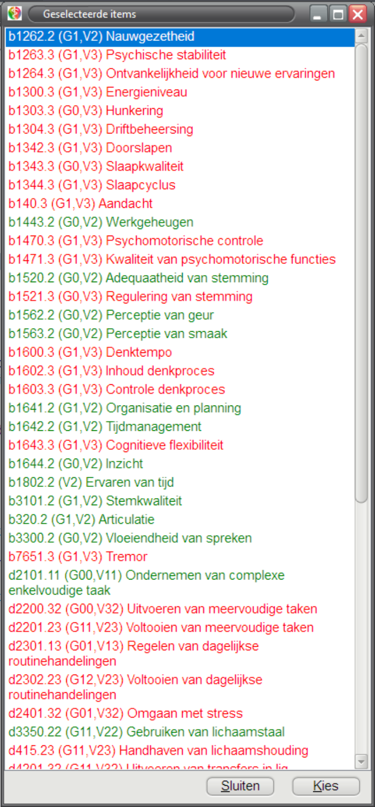 De ICF classificatie bevat veel takken en voor je het weet ben je je overzicht een beetje kwijt. Met de keuze van "Geselecteerde items" uit het popupmenu krijg je in een venster alle ICF items te zien die je als uitvoer hebt geselecteerd. Je kunt zo zien wat je hebt geselecteerd en door op één van de geselecteerde items te klikken kun je daarna op de knop "Kies" te drukken ga je in de ICF boom naar de gekozen ICF item.