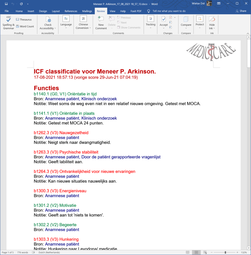 Maak van de geselecteerde ICF items uitvoer en stuur die uitvoer naar MS-Word. De uitvoer kun je bewerken, bewaren/opslaan of naar een EPD kopiëren.