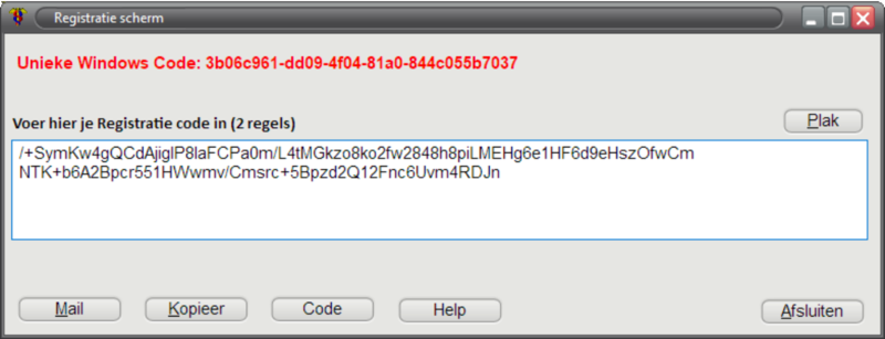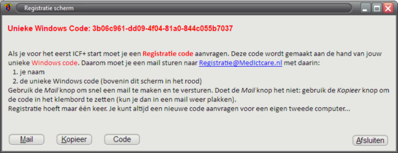 Als je de ICF+ download en installeert en daarna opstart dan verschijnt (voor Chiron gebruikers gaat de registratie automatisch) het registratie venster. Druk op de knop "Mail" om een mail te sturen met de nodige informatie naar MedIctcare. Lukt de knop "Mail" niet, gebruik dan de knop "Kopieer" om de gegevens naar het klembord te kopieren. Je kunt dan je mail programma opstarten en naar MedIctcare een mail sturen en de informatie uit het klembord in de mail plakken. Als je de mail hebt gestuurd krijg je van MedIctcare een mail met daarin een twee regelige registratiecode. Als alles goed verloopt zal de software bij het opstarten kijken of je geregistreert bent en de registratiecode ophalen (als die er is). Mocht je toch handmatig willen registreren druk dan op de knop "Code" en plak de in de mail staande registratiecode in het venster en druk op de knop "Afsluiten".