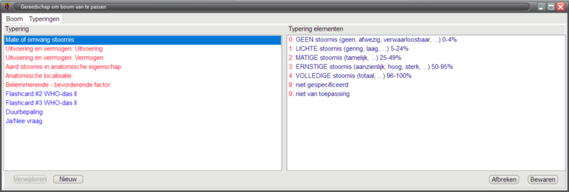 Hier kun je nieuwe typeringen aanmaken en de door jouw gemaakte typeringen aanpassen. De typeringen die officieel gebruikt worden in de ICF-CY kun je niet aanpassen (en worden in de kleur rood getoond).