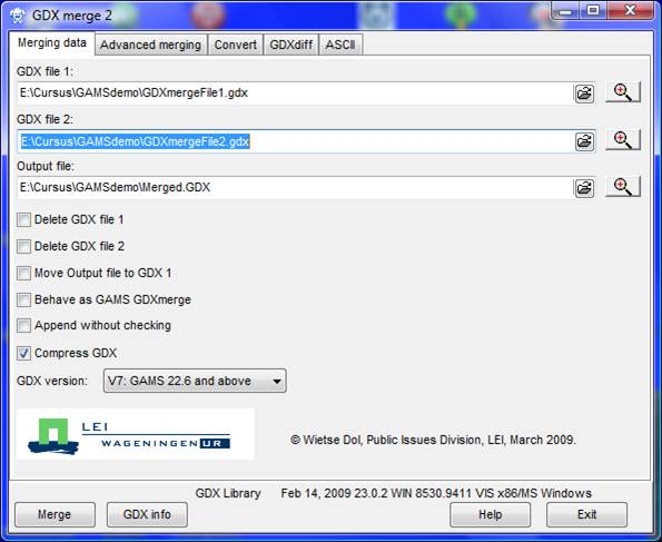 The GAMS GDXmerge doesn’t really merge two GDX files, but when a parameter is defined in both GDX files, the parameter will get an additional set (with as elements the 2 file names). A real merging, according to us, would mean that you take the values of the first GDX file and that add the values of the second GDX files, this means adding new values and overwriting some values of the first file. See GDXtools.doc